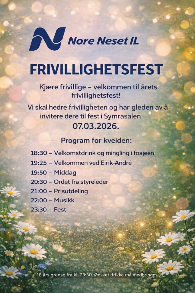 Vi ønsker velkommen til årets frivillighetsfest i Nore Neset IL som holdes i Symrasalen.