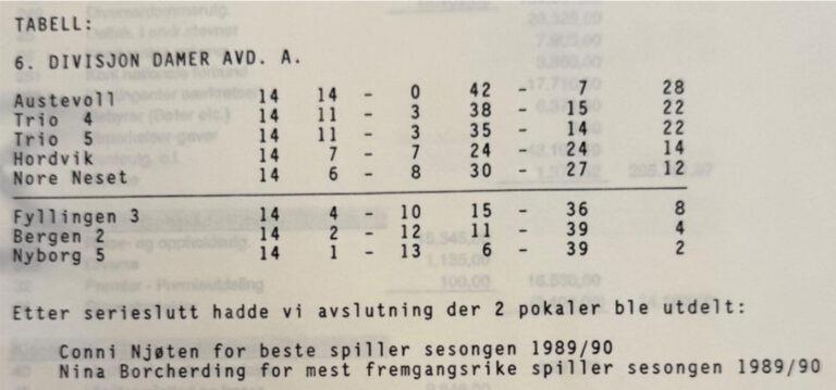 Damene spelte i 6.divisjon, og kom på 5.plass forrige sesong. Det var 10-12 jenter på laget, og dei hadde to treningar i veka (ein i Oshallen ein på Nore Neset), trenaren for sesongen 1989/90 var Jørn Aasberg, og ny trenar for 1990/91 var Vibeke Leikvoll Moberg.